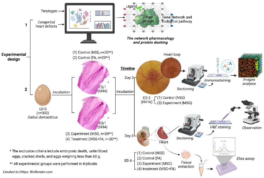 The present study aimed to investigate whether MSG and its metabolites disrupt key signaling pathways during embryonic heart development and the treatment role of folic acid in a chick embryo model that most closely resembles human development. Moreover, to understand the heterogeneity of CHDs and explore common molecular targets and signaling pathways, we sought to identify the molecular targets and pathways influenced by MSG, focusing on their contribution to CHDs.