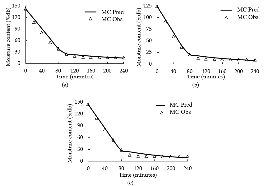 The validation test of the drying kinetics in simulating the predicted moisture content to the observed moisture content in each variation of bagasse particle size are shown in Figure 3. The validation was performed by calculating the R² value. The R2 values which is close to ”1” indicates that the predicted moisture content changes closely represent the observed changes during the drying process [25].