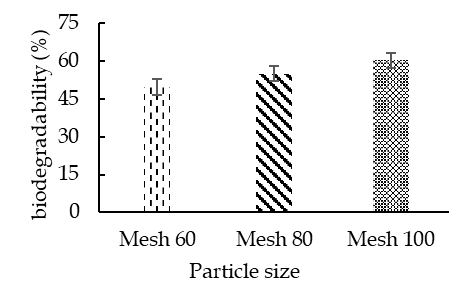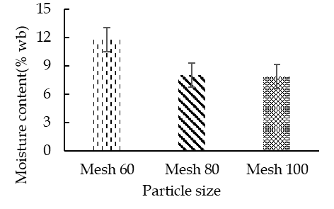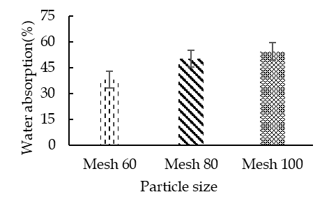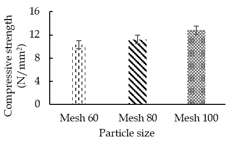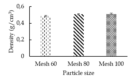 Moisture content of the biofoam produced using sugarcane bagasse particles of varying sizes as filler is presented in Figure 4. Based on the figure, it can be observed that the highest moisture content was found in the biofoam with a particle size of mesh 60, at 11.78%, followed by mesh sizes 80 and 100, at 8.05% and 7.86%, respectively. This indicates a trend where smaller particle sizes result in lower moisture content in the produced biofoam. The smaller particles of sugarcane bagasse provides a larger surface area of drying, which facilitates water diffusion and promotes faster moisture evaporation, resulting in faster drying of the biofoam. [23].