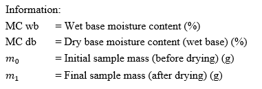 In the process of drying biofoam by the baking method, changes in the moisture content of the sample were observed using the thermogravimetric method to identify the drying rate. Observations were made by weighing samples every 20 min for 4 h. After weighing in the last 20 min, the sample was dried at a temperature of 105 °C for 24 h to achieve a balanced moisture content then the data obtained was analyzed with Eq. (1) for wet base moisture content (wb), while for dry base moisture content (db) using Eq. (2). The moisture content data is then re-analyzed to calculate the drying rate of the biofoam.