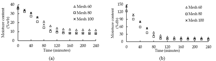 Analysis on the rate of moisture content change was conducted as an indicator of the drying process speed, which is assumed to be influenced by the particle size of the bagasse used as a filler material in the biofoam.