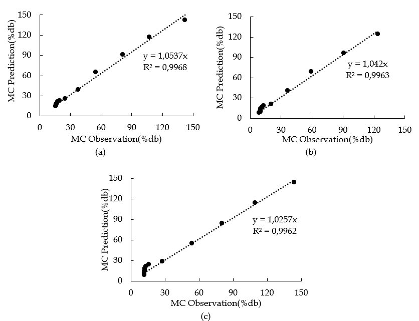 Figure 3 Validation of the prediction model against observed biofoam moisture content using R² values for: (a) mesh 60, (b) mesh 80, (c) mesh 100