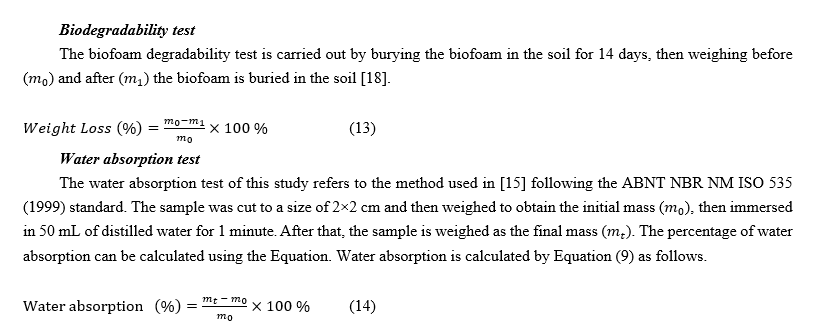 The density testing in this study refers to the ASTM D 792-08 method conducted by [15] namely cutting a biofoam sample with a size of 3×3 cm then multiplying it by the thickness of the sample to obtain a volume value (V), then weighing it using an analytical scale to obtain the sample mass (m). The density (ρ) is calculated by Eq. (11).