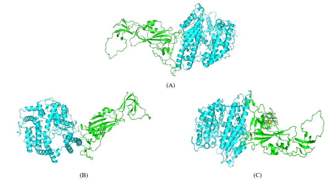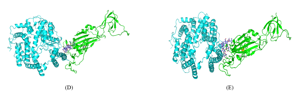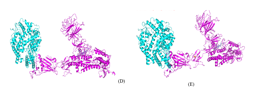 Figure 7 The 3D structure of ACE2-Spike Gamma variant complex docked using HDOCK where ACE2 is shown in cyan and Spike Gamma variant is shown in red (A), 3D structures of silver NP docked in ACE2-Spike Gamma variant (B), 3D structure of gold NP docked in ACE2-Spike Gamma variant (C), 3D structure of ACE2-Spike Gamma variant complex showing the synergetic binding of silver NP and B-escin (D) and gold NPs and B-escin (E).