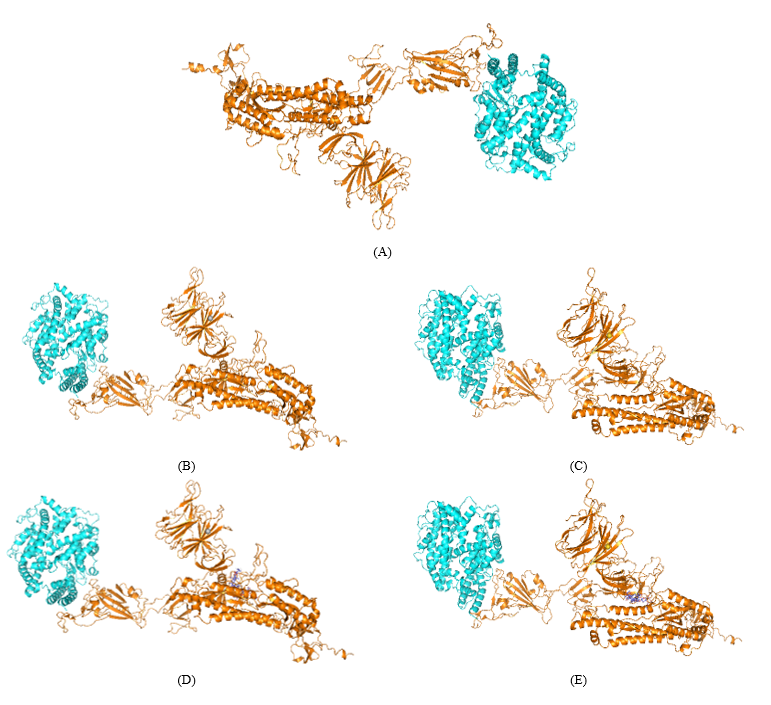 Figure 6 The 3D structure of ACE2-Spike Omicron variant complex docked using HDOCK where ACE2 is shown in cyan and Spike Omicron variant is shown in orange (A), 3D structures of silver NP docked in ACE2-Spike Omicron variant (B), 3D structure of gold NP docked in ACE2-Spike Omicron variant (C), 3D structure of ACE2-Spike Omicron variant complex showing the synergetic binding of silver NP and B-escin (D) and gold NPs and B-escin (E).