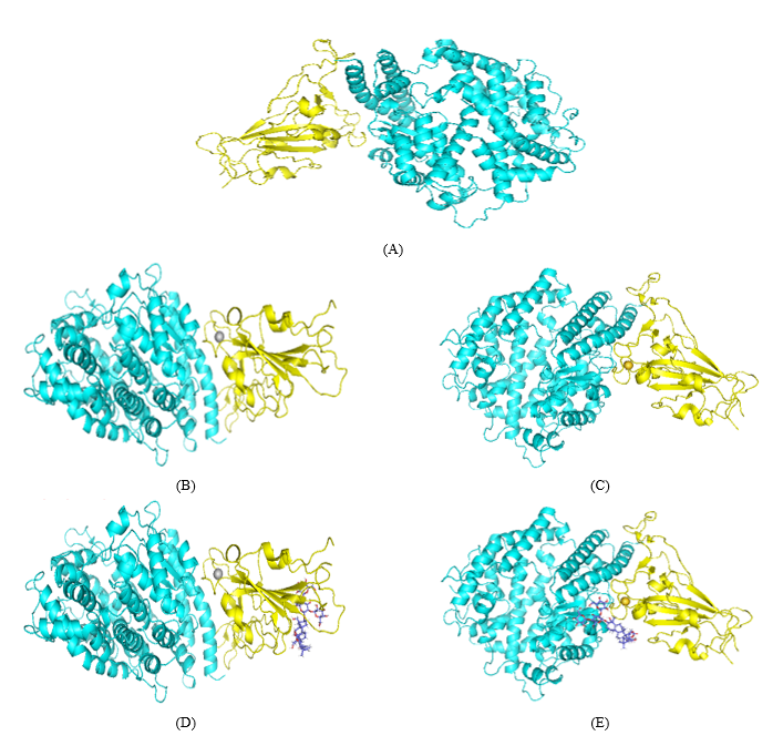 Figure 5 The 3D structure of ACE2-Spike Delta variant complex docked using HDOCK where ACE2 is shown in cyan and Spike Delta variant is shown in yellow (A), 3D structures of silver NP docked in ACE2-Spike Delta variant (B), 3D structure of gold NP docked in ACE2-Spike Delta variant (C), 3D structure of ACE2-Spike Delta variant complex showing the synergetic binding of silver NP and B-escin (D) and gold NPs and B-escin (E).