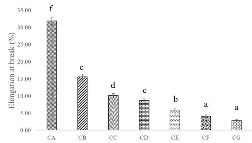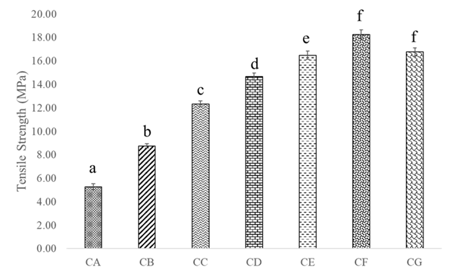 Figure 3 Tensile strength of the biopolymer composites developed from TPS and PBS reinforced with various % RSF; CA = 0 % RSF, CB = 10 % RSF, CC = 15 % RSF, CD = 20 % RSF, CE = 25 % RSF, CF = 30 % RSF, and CG = 35 % RSF, Data are shown as mean ± SD for 5 replications. Bars having different letters are significantly different at p < 0.05.