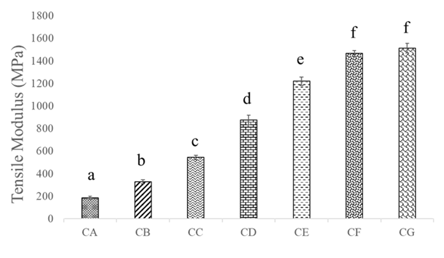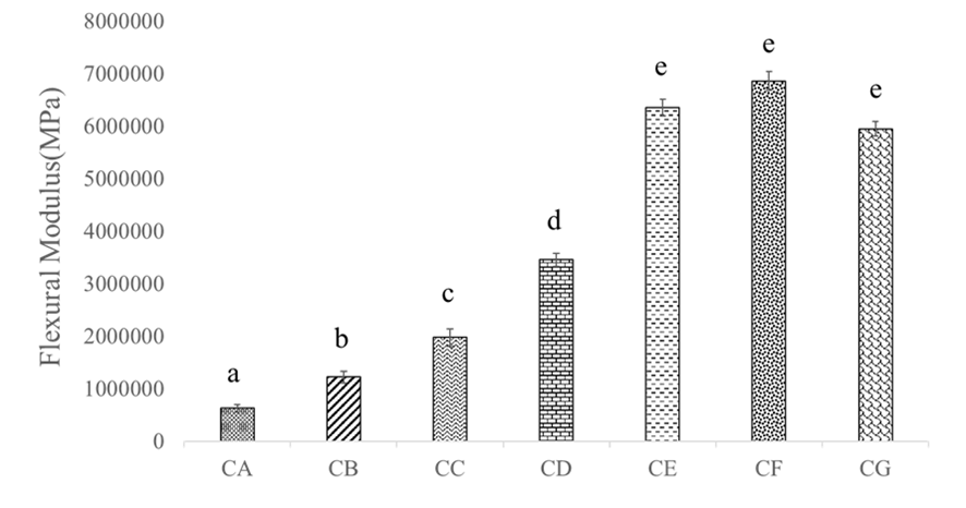 Figure 8 Flexural moduli of the biopolymer composites developed from TPS and PBS reinforced with various RSF; CA = 0 % RSF, CB = 10 % RSF, CC = 15 % RSF, CD = 20 % RSF, CE = 25 % RSF, CF = 30 % RSF, and CG = 35 % RSF, Data are shown as mean ± SD for 5 replications. Bars having different letters are significantly different at p < 0.05.