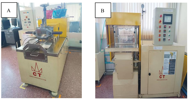 The TPS, PBS and RSF were thoroughly mixed in an internal mixer (MX 500-D75L90, Figure 2(A)) at 145 ± 10 °C for 15 min with a rotation speed of 50 rpm. Thereafter, the resulting polymer composites were ground using blender machine, oven dried at 50 °C for 24 h followed by molding in a Hot Compression molding (PR2D-W300L350 PM-WCL-HMI, Figure 2(B)). The molding process was performed at a condition of 145 °C, 5 min heating, 5 min molding, and 5 min cooling according to ASTM D2240, ASTM D790, ASTM D256, and ASTM D638 standard.