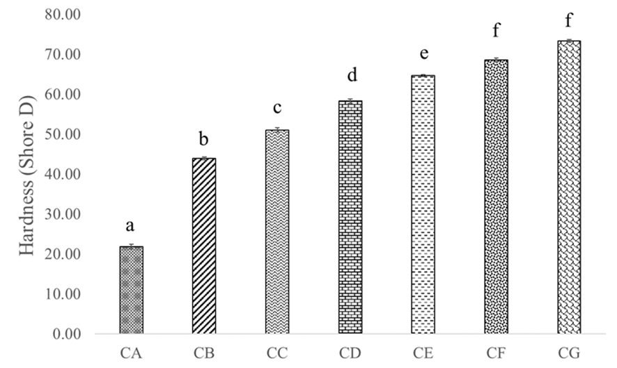 Figure 7 Hardness of the biopolymer composites developed from TPS and PBS reinforced with various % RSF; CA = 0 % RSF, CB = 10 % RSF, CC = 15 % RSF, CD = 20 % RSF, CE = 25 % RSF, CF = 30 % RSF, and CG = 35 % RSF, Data are shown as mean ± SD for 5 replications. Bars having different letters are significantly different at p < 0.05.