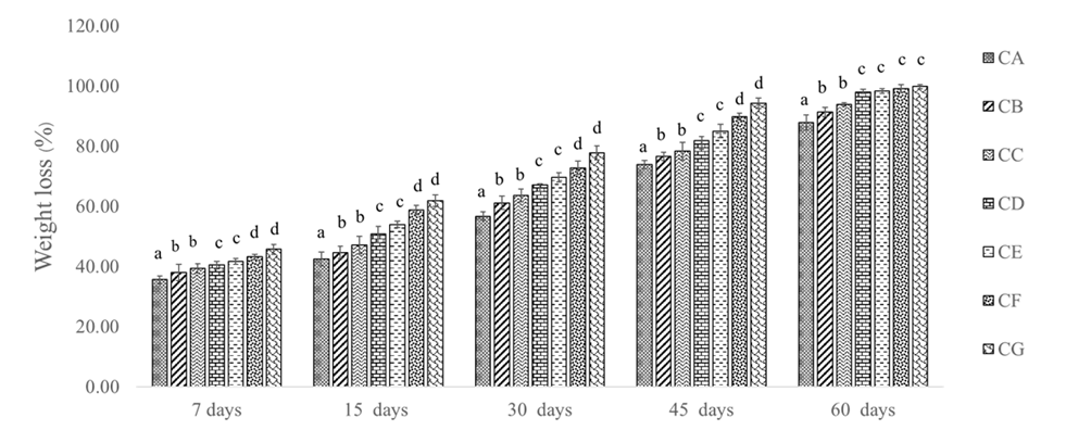 Figure 10 Weight loss (%) of the polymer composites developed from various ratios among TPS and PBS reinforced with RSF; CA = 0 % RSF, CB = 10 % RSF, CC = 15 % RSF, CD = 20 % RSF, CE = 25 % RSF, CF = 30 % RSF, and CG = 35 % RSF, Data are shown as mean ± SD for 5 replications. Bars having different letters are significantly different at p < 0.05.