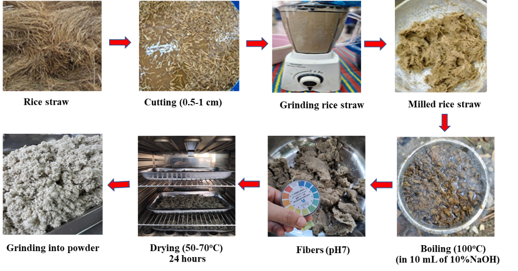 The RSF were prepared according to a procedure previous described [36] with some modifications. In brief, the rice straws were shade dried for 2 days to eliminate humidity, cut into 0.5 - 1 cm in length, ground using an electrical grinder machine and sieved using mesh 50 - 120. The fiber size was based on optimum tensile, flexural and impact strength [21]. The obtained fibers were soaked in 10 % NaOH (sodium hydroxide) solution, with a ratio of 1 g of RSF in 10 mL of 10 % NaOH, and boiled at 100 °C for 2 h. The boiled fibers were washed thoroughly with abundance distilled water until the pH of fibers was pH7. The resulted fibers were oven dried at 50 - 70 °C for 24 h. Subsequently, they were ground into powder, as shown in Figure 1.