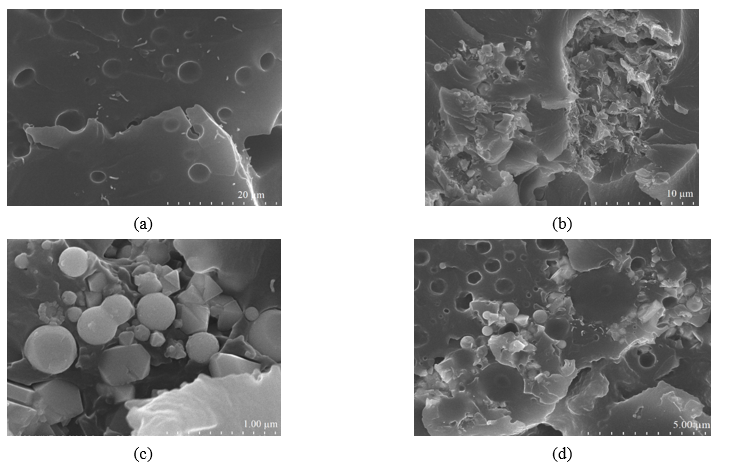 Figure 5 SEM image of epoxy/ELO/MWCNTs/nanoclay I.30E/CP/Sb2O3 nanocomposite. (a) MWCNTs 0.10 wt.%/ELO 10 wt.%, (b) MWCNTs 0.10 wt.%/I.30E 2wt.%/CP 9 wt.% Sb2O39 wt.%, (c) MWCNTs 0.10 wt.%/CP 9 wt.% Sb2O39 wt.%, and (d) MWCNTs 0.10 wt.%/CP 9 wt.% Sb2O39 wt.%/ELO 10 wt.%.