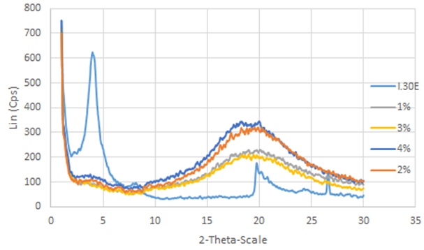The XRD diagram in Figure 3 confirms the successful exfoliation of I30E nanoclay within the epoxy matrix. Initially, the presence of nanoclay was indicated by a diffraction peak at 2θ = 40 °, corresponding to an interlayer distance of d = 22.128 Å. However, in the nanocomposite sample containing 2 wt.% of nanoclay, this peak disappeared. This suggests that the EE240 epoxy molecules penetrated into the interlayer spaces of the nanoclay, significantly increasing the interlayer distance and ultimately leading to the loss of the ordered layered structure.