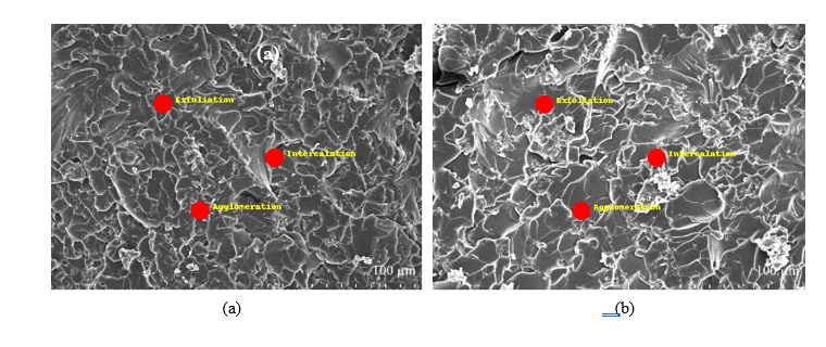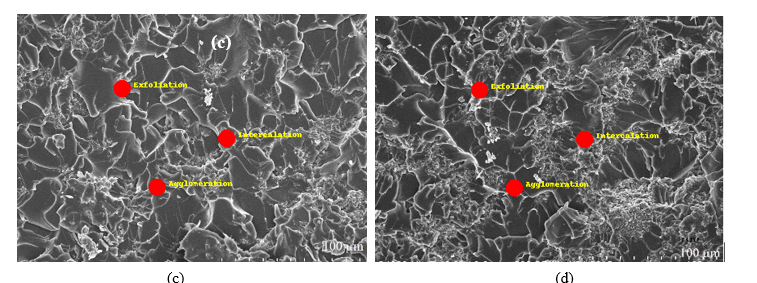 In the SEM images, the characteristic regions of nanoclay dispersion in the epoxy matrix can be identified as follows: Exfoliation (complete delamination) occurs when the nanoclay layers are fully dispersed into the epoxy matrix, forming a homogeneous structure. In the SEM image, this region appears smoother with fewer large particle clusters, indicating an even distribution of nanoclay, which enhances the mechanical and thermal properties of the material. Intercalation represents the arrangement of nanoclay layers in a parallel or stacked structure, but without complete separation. In the SEM image, this region shows layered structures with some gaps between the layers. Although it improves the mechanical properties compared to pure epoxy, its effectiveness is lower than exfoliation. Agglomeration refers to the clustering of nanoclay particles into large aggregates that are not evenly dispersed within the epoxy matrix. In the SEM image, this region appears as dense, non-uniform structures with bright spots or larger clusters. This phenomenon can reduce the mechanical properties of the material by creating micro-defects and compromising overall durability.