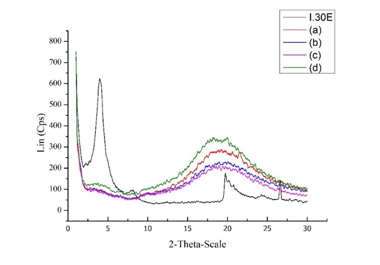 From the results in Table 1, the d-spacing values gradually increase from sample (a) to (d), indicating that the epoxy polymer has intercalated into the nanoclay layers, expanding the interlayer spacing. Sample (d) exhibits the largest d-spacing values (12.36 and 4.74 Å), suggesting the most significant intercalation. Compared to the initial nanoclay (I.30E), which had interlayer spacings of 10.39 and 4.27 Å before mixing, the increased d-spacing after incorporation into epoxy confirms strong polymer-nanoclay interactions. This suggests a trend towards intercalation or partial exfoliation of the nanoclay within the epoxy matrix, which can enhance the composite’s mechanical and thermal properties. However, excessive nanoclay content may lead to agglomeration, potentially reducing dispersion efficiency and limiting the overall material performance.