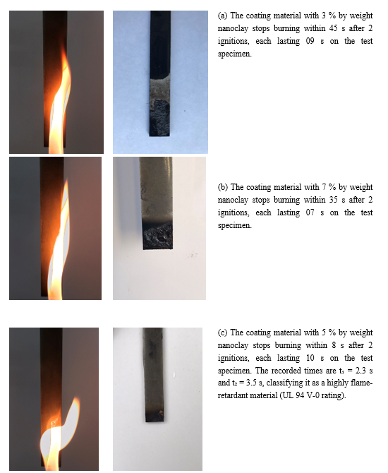Furthermore, Nguyen [30] developed a flameretardant nanocomposite coating using Epikote 240 epoxy resin with MWCNTs and fly ash, achieving a UL-94 V0 rating. However, the char formation and overall improvement in flame resistance relied heavily on the synergistic effect of fly ash and MWCNTs rather than nanoclay alone [30].