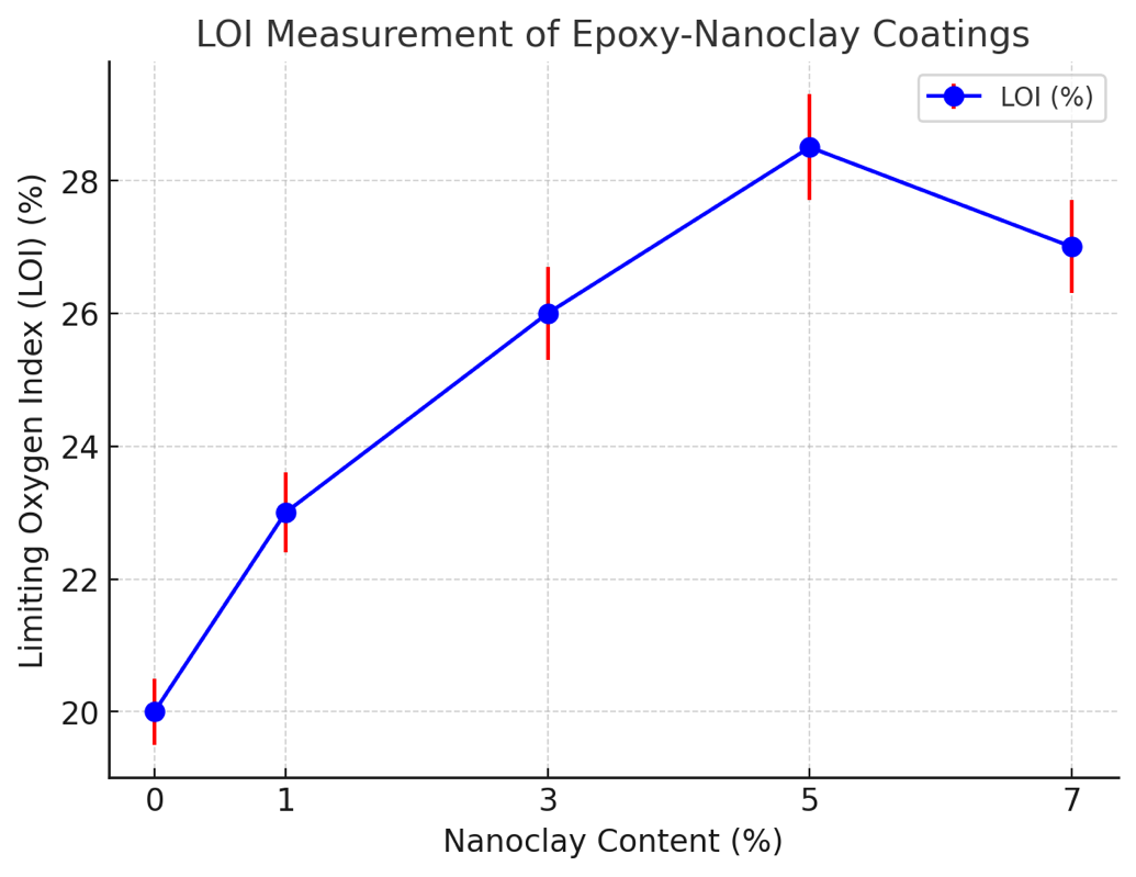 The Limiting Oxygen Index (LOI) test was conducted to measure the minimum oxygen concentration required to sustain combustion. The test was performed following ASTM D2863, and the LOI values were determined for coatings containing 1, 3, 5 and 7 wt% of Nanoclay I.30E.