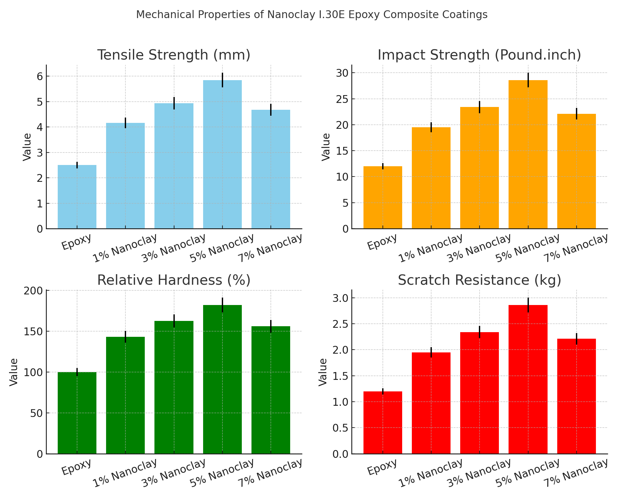 The improvement in the mechanical properties of epoxy nanocomposites with the addition of 5 % I.30E nanoclay offers significant practical benefits in applications requiring high durability, impact resistance, and wear resistance. Specifically, in protective coatings, this material enhances hardness, scratch resistance, and reduces cracking, thereby extending the lifespan of metal surfaces in harsh environments. In the aerospace industry, epoxy nanocomposites can be utilized in aircraft and satellite components due to their lightweight nature and superior load-bearing capacity, optimizing operational efficiency. Additionally, in construction and structural reinforcement, this material contributes to increased durability, dynamic load resistance, and crack prevention, thereby extending the lifespan of infrastructure. These improvements not only hold scientific significance but also present vast practical applications, driving the development of sustainable and high-performance materials across multiple critical industries.