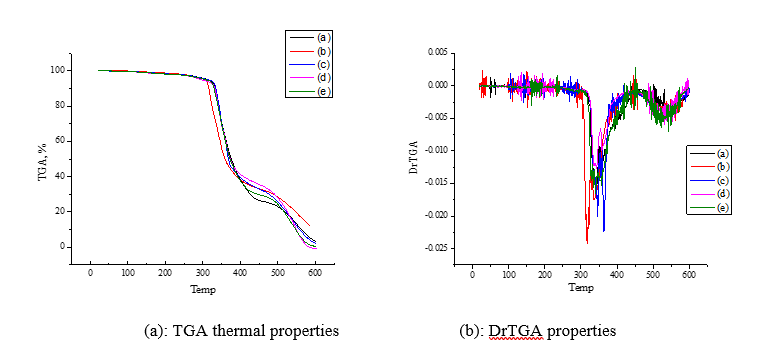 Figure 3 Thermal stability of nanoclay epoxy composite coating materials: Epoxy/1 % nanoclay: (a); Epoxy polyme: (b); Epoxy/5 % nanoclay: (c); Epoxy/3 % nanoclay: (d); Epoxy/7 % nanoclay: (e).
