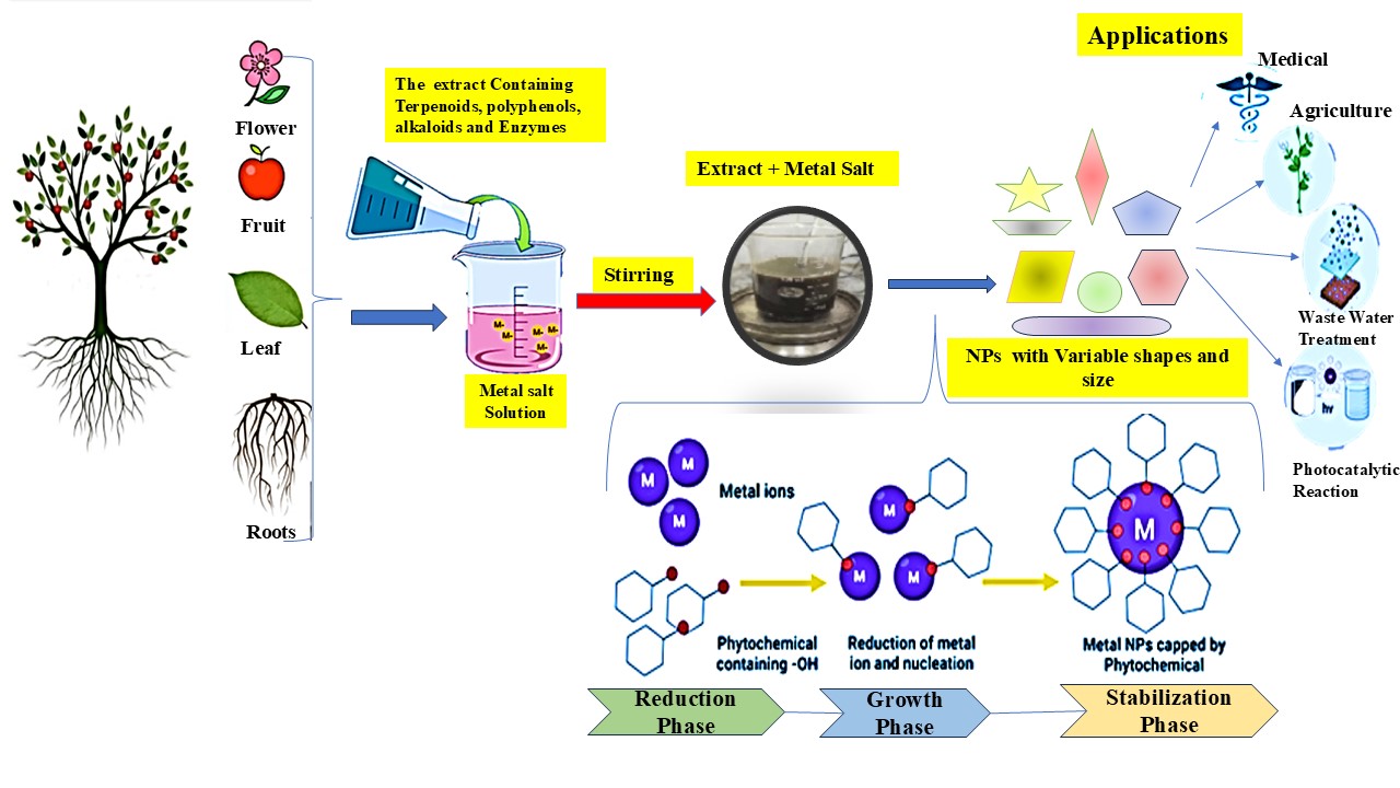 Plants are readily accessible and safe to handle, scientists have placed a great deal of attention on using plant extracts in the creation of nanoparticles. Applications for MONPs (Metal oxide Nanoparticles) are numerous and include drug delivery systems, catalysts, active food packaging materials, parts for nano-biosensor construction, gene transfer systems, antibiotics, antiseptics, disinfectants, and pathogen and pest control solutions, as well as nanoelectronic components. When using plant-mediated methods, biosynthesis proceeds at a faster pace than environmentally when using methods focused on microorganisms, and the resultant nanoparticles (NPs) are more stable and varied in size and shape. Because they are easy to use, inexpensive, and environmentally beneficial for producing large quantities of NPs in a short amount of time, plant extracts are frequently used in the green synthesis of metal-based NPs [21]. In order to create nanoparticles (NPs), extracted phytochemicals are added to metal salt solutions, where they lower the metal ions and connect to the NPs to serve as capping or stabilizing agents. These non-toxic capping agents stop NPs from aggregating. Furthermore, there is better control over the formation of NP crystals using biological methods due their kinetics are slower than those of chemical approaches [22-25].