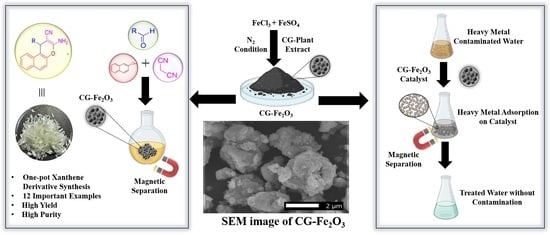 Thakur et al. [47] developed magnetic iron nanoparticles from Chenopodium glaucum (CG) and it act as an efficient and recyclable heterogeneous catalyst for one-pot synthesis of xanthene derivatives, yielding products with high yields (up to 97 %) and excellent purity (crystalline form) within a short timeframe (6 min) using microwave irradiations (at 120 W) (Figure 5).