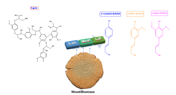 Lignin is a complex polymer made up of phenylpropane units interconnected by a variety of ether and carbon bonds [1]. Lignin is made of phenolic units (p-hydroxyphenyl, guaiacyl and syringyl), which contributes to its stiffness and resistance to degradation (Figure 1) [2]. Oxidative enzymes, such as lignin peroxidase (LiP), manganese peroxidase (MnP) and laccase (LAC), emitted by a filamentous organism from the class basidiomycetes, are the primary chemicals having the choice to degrade the unmanageable plant cell-wall constituent called lignin. Phenyl propanoid units are connected by various non-hydrolysable C-C and C-O bonds in this somewhat different and many-sided biopolymer [3]. The deterioration of lignin in nature is primarily caused by white-decay basidiomycetes, a highly specific group of microorganisms that secrete a consortium of oxidative impetuses, resulting in a finished surface and a whitish variety of spoiled wood. White-decay basidiomycetes deteriorate lignin by means of the cooperative action of classII heme-containing peroxidases and laccases, the main ligninolytic compounds, as well as a variety of helper catalysts. The oxidation of substrates is catalyzed by lignin peroxidase, manganese peroxidase, and adaptable peroxidase, which use hydrogen peroxide (H2O2) as an oxidant [4].