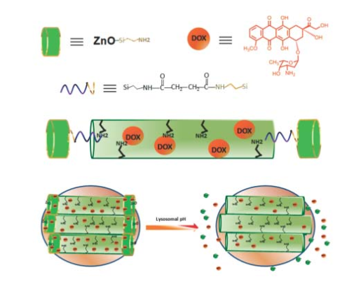Figure 12 Graph of ZnO@MSNs-DOX. Mesoporous silica nanoparticles are stacked with cationic anticancer medicate doxorubicin and beautified with amine-functionalized ZnO nanoparticles. Within the acidic environment of cancer cells, the ZnO caps are corrupted and the doxorubicin sedate is discharged from the pores into the cancer cells [28].