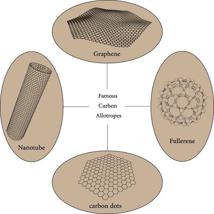 Carbon is found abundantly on earth and therefore it is used in many different fields of science and technology [23-25]. Elemental carbon exists in the form of different allotropes based on the hybridization of its atoms, and several different forms of this material are known at the nano scale, such as carbon dots, graphene quantum dots, fullerene, carbon nanotubes, and graphene (Figure 3) [26,27].