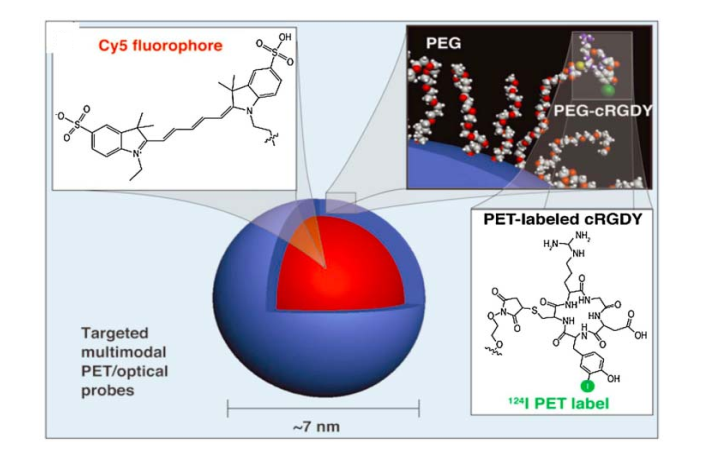 Figure 11 Schematic of 124I-cRGDY-PEGylated core-shell silica nanoparticles with radiolabels and peptides on the surface and reactive dye molecules containing core [20].