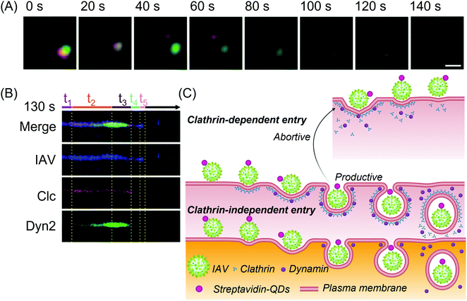 Figure 9 Images of dynamic dissociation of RNA labeled with quantum dots (green) from capsid (red) [54].