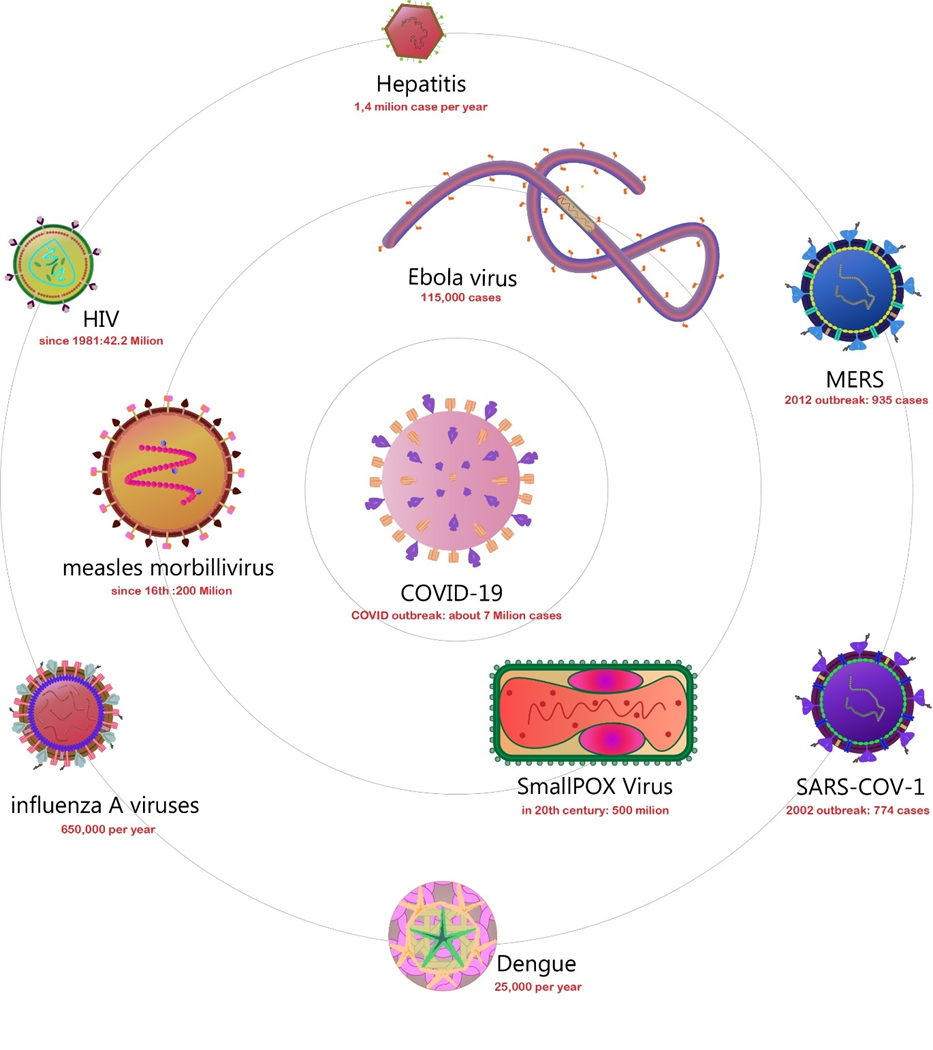 Figure 1 Viruses that have caused large-scale infectious diseases in human history, arranged in descending order of casualties [17-22].