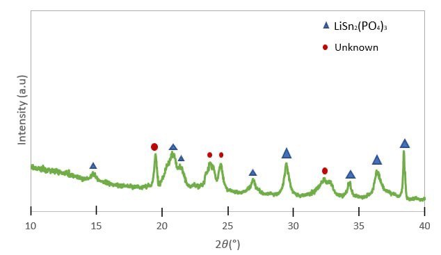 Ceramic electrolytes (LSPO) were prepared using the sol-gel method as previously reported in the literature [9]. A molar ratio of 1:2:3 was used for lithium acetate (CH3COOLi), stannum (IV) chloride pentahydrate (SnCl4·5H2O), and ammonium phosphate (H12N3O4P), which were dissolved under magnetic stirring. Citric acid (C6H8O7), polyethylene glycol (C2H6O2), and ammonium hydroxide (NH4OH) were then added and stirred homogeneously into the solution for 24 h. The resulting solution was vaporized at 80 °C for 4 h, producing a gel. This gel was dried in an oven at 150 °C for another 24 h.