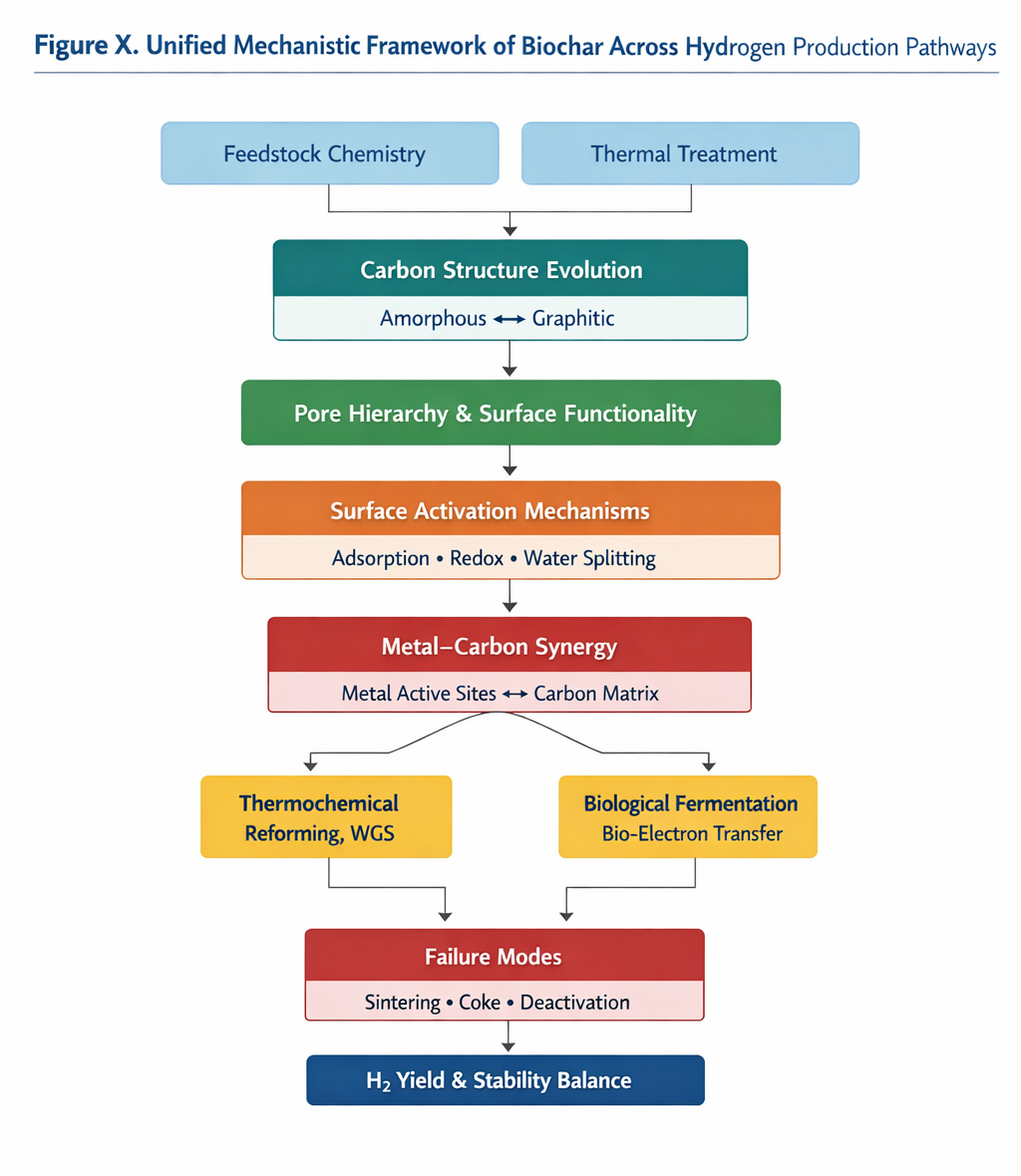 These constraints highlight the need for alternative catalytic systems that are sustainable, economically viable, and compatible with biomass valorization. Biochar-based catalysts derived from agricultural and forestry residues offer renewable carbon frameworks with tunable porosity and surface functionality. When modified with transition metals such as Ni or Fe, biochar can serve as an efficient and low-cost platform for reforming and gasification processes. By coupling waste biomass utilization with hydrogen production, this approach addresses both catalytic performance and circular bioeconomy objectives, positioning biochar as a promising material in the development of scalable, low-carbon hydrogen technologies.