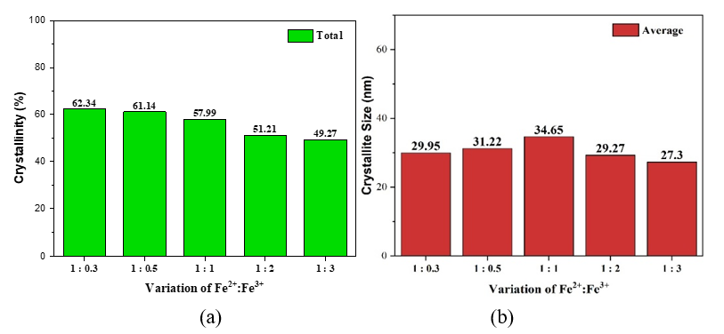 The presence of Fe2+ and Fe3+ ions can also affect the crystallinity index and crystallite size of photocatalyst, as seen in Figure 3. This crystallinity was calculated based on Wibowo et al. [14], and crystal size was obtained based on the Scherrer equation [15].
