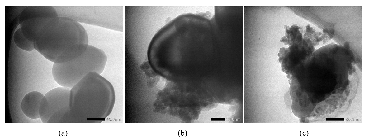 Figure 14 TEM images of (a) TiO2 (b) TF0.2 composite, and (c) TF1 composite.