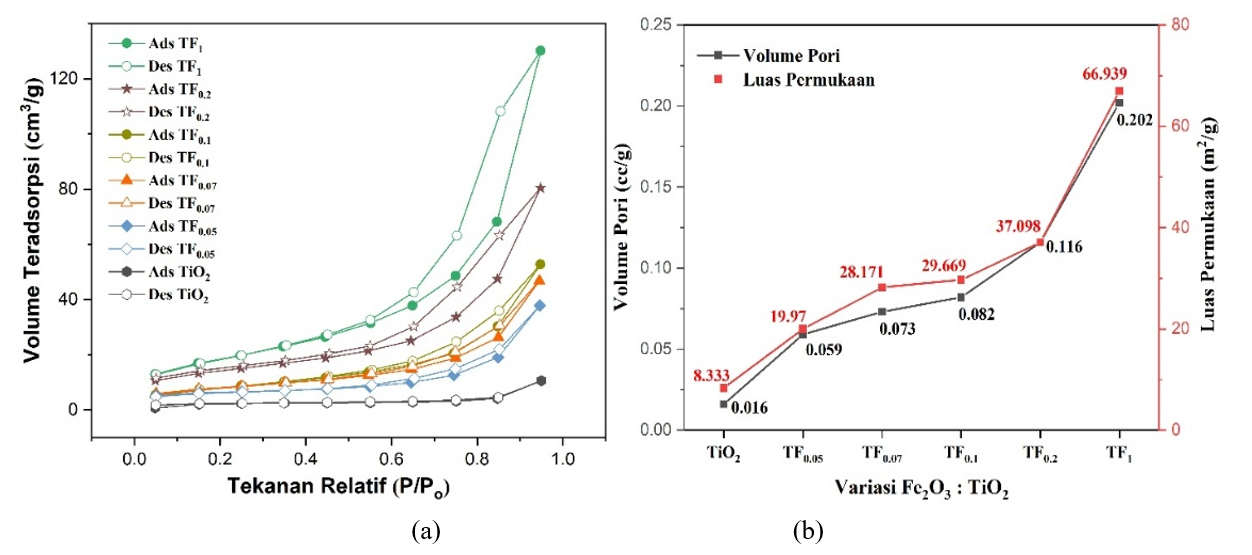 In this section, TiO2-Fe/Fe2O3 photocatalyst have been synthezised with a constan mole ratio of TiO2: Fe2O3 = 1:1/5 (TF0.2). Meanwhile, the variation of Fe2+: Fe3+ was carried out at mole ratio Fe2+: Fe3+ = 1:0.3, 1:0.5, 1:1, 1:2 and 1:3 (mole/mole).