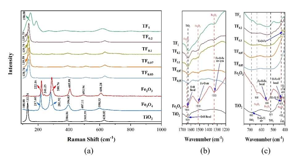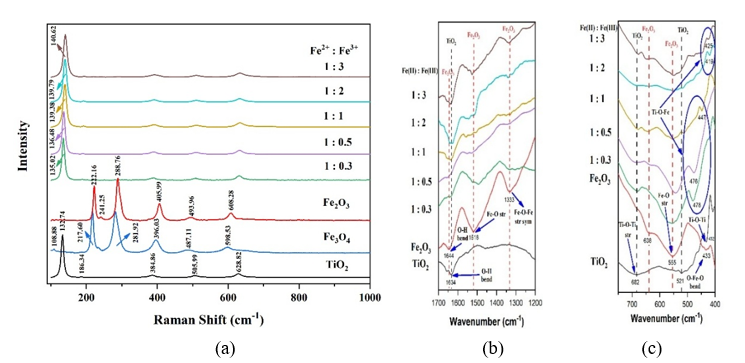 Figure 1 (a) Raman, and (b) - (c) FTIR Spectra of TiO2, Iron Oxide, and composites in the variation of composition Fe2+: Fe3+ (mole/mole).