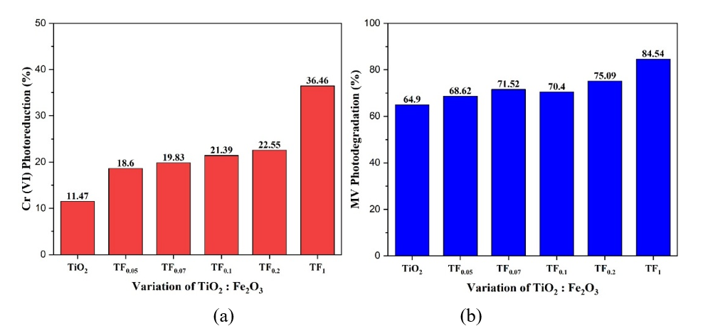 Photocatalytic activity. The variation in TiO2: Fe2O3 composition (mole/mole) has affected photocatalysis activities. as shown in Figure 16. Figure 16 showed that increasing Fe2+ and Fe³⁺ concentration as increasing Fe2O3 composition enhances the photocatalytic activity of TiO2 powder under visible-light irradiation. The increase in photocatalytic activity was also shown by increasing the composition of Fe3+ compared to Fe2+. The improvement is attributed to bandgap narrowing, reduced crystallinity and crystallite size, and enlarged surface area. Based on the results, Methyl Violet (MV) degradation is more pronounced than Cr(VI) photoreduction, suggesting that Fe³⁺ primarily functions as an electron trap rather than a hole trap.