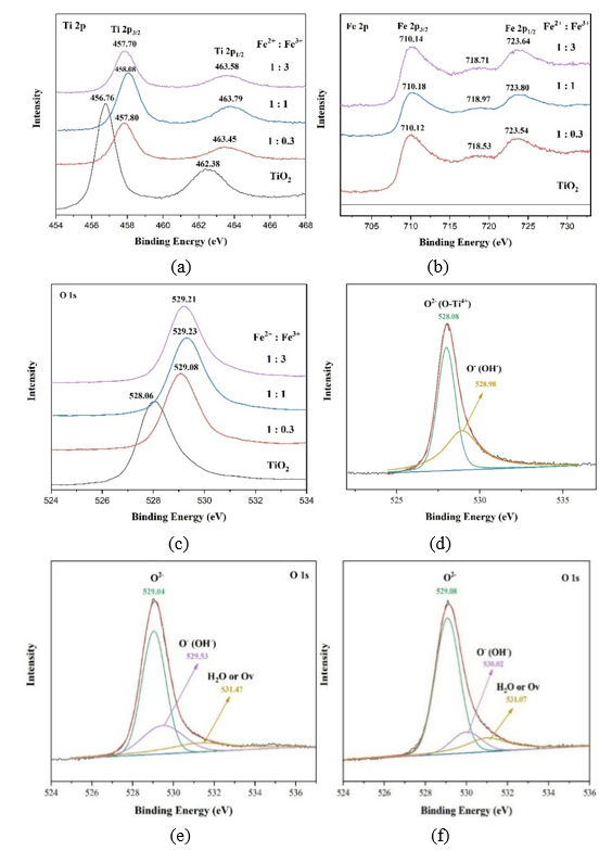 Figure 6(a) showed Ti 2p peaks at 456.8 eV (2p₃/₂) and 462.4 eV (2p₁/₂), with a spin spillting of 5.65 - 5.88 eV, confirming Ti⁴⁺. Incorporation of Fe ions causes binding energy shifts in both Ti 2p peaks, indicating Fe-O-Ti bond formation. At lower Fe³⁺ content (Fe²⁺: Fe³⁺ = 1:0.3 - 1:1), a positive shift of Ti 2p suggests heterojunction formation, driven by electron transfer from TiO₂ (higher Fermi level) to Fe₂O₃ (lower Fermi level), which reduces TiO₂ electron density and increases binding energy. At higher Fe³⁺ content (Fe²⁺: Fe³⁺ = 1:1 - 1:3), a negative Ti 2p shift occurs (~0.1 - 0.5 eV) due to substitutional doping of Ti⁴⁺ by Fe³⁺, which generates oxygen vacancies and promotes Ti³⁺ formation as a charge compensation mechanism, then subsequently increasing the electron density and reducing the binding energy of Ti 2p [16,26]. Consistently, binding energy of O 1s spectra (Figure 6(c)) also exhibits positive shifts (528.06 → 529.23 eV) with increasing Fe³⁺, attributed to charge redistribution from Ti⁴⁺ substitution by Fe³⁺, consistent with lattice distortion and oxygen vacancy formation [16,27]. Based on Figures 6(d) - 6(f), the deconvoluted O 1s spectra showed a new peak at 531.17 eV, absent in pure TiO₂ (Figure 6(d)), which indicated the presence of oxygen vacancies, with intensity increasing as Fe³⁺ content rises. The results demonstrated that higher Fe3+ content enhances oxygen vacancy formation and Fe-O-Ti bonding, mainly through substitutional doping [26]. So that in this case, not only the interfacial interaction and heterojunction occurred but also the doping increased with increasing Fe3+ composition.