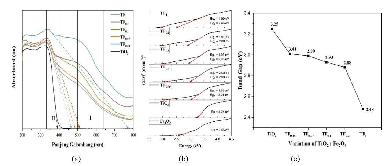 Figure 12 (a) DRS spectra, (b) tauc plots, and (c) band gap of composites with Fe₂O₃: TiO₂ compositions.