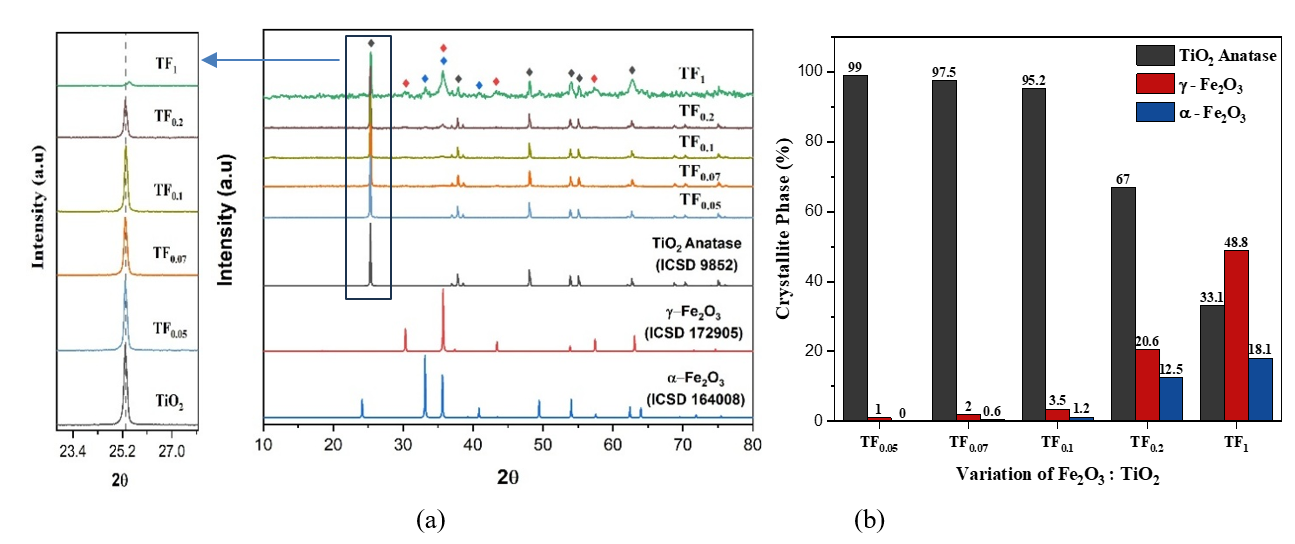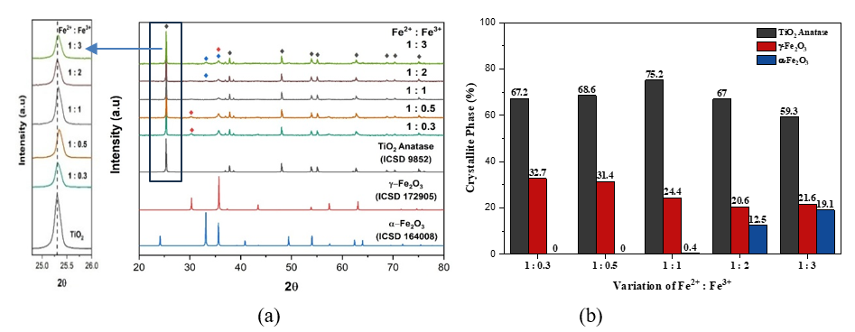 Figure 3(a) indicated that Fe³⁺ more effectively suppresses TiO₂ crystallinity than Fe²⁺ due to its smaller ionic radius and higher charge, which enhance lattice distortion and disorder [5,16]. As shown in Figure 3(b), at low Fe³⁺ levels (Fe²⁺: Fe³⁺ = 1:0.3 - 1:1) promote interfacial interactions between TiO2 and Fe2O3 so that enlarge particle growth and crystallite size [1,17]. The interfacial interactions such as sintering, coupling, or aggregation facilitate heterojunction formation. Whereas, at higher Fe³⁺ compositions (Fe²⁺: Fe³⁺ = 1:1 - 1:3), it induces severe distortion and defects, reducing both crystallinity and crystallite size, and then facilitates Fe ion doping. Loan et al. [11] stated that the greater the Fe3+ doping into TiO2, the smaller the crystallite size. The greater the Fe3+ doping, the greater the distortion and defects so that the deformation becomes greater and the crystallite size becomes smaller.