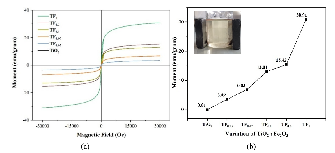 Figure 15 (a) VSM Loop hysteresis and (b) saturation magnetic (Ms) of composite with TiO2: Fe2O3 composition (insert:separation with an external magnet).