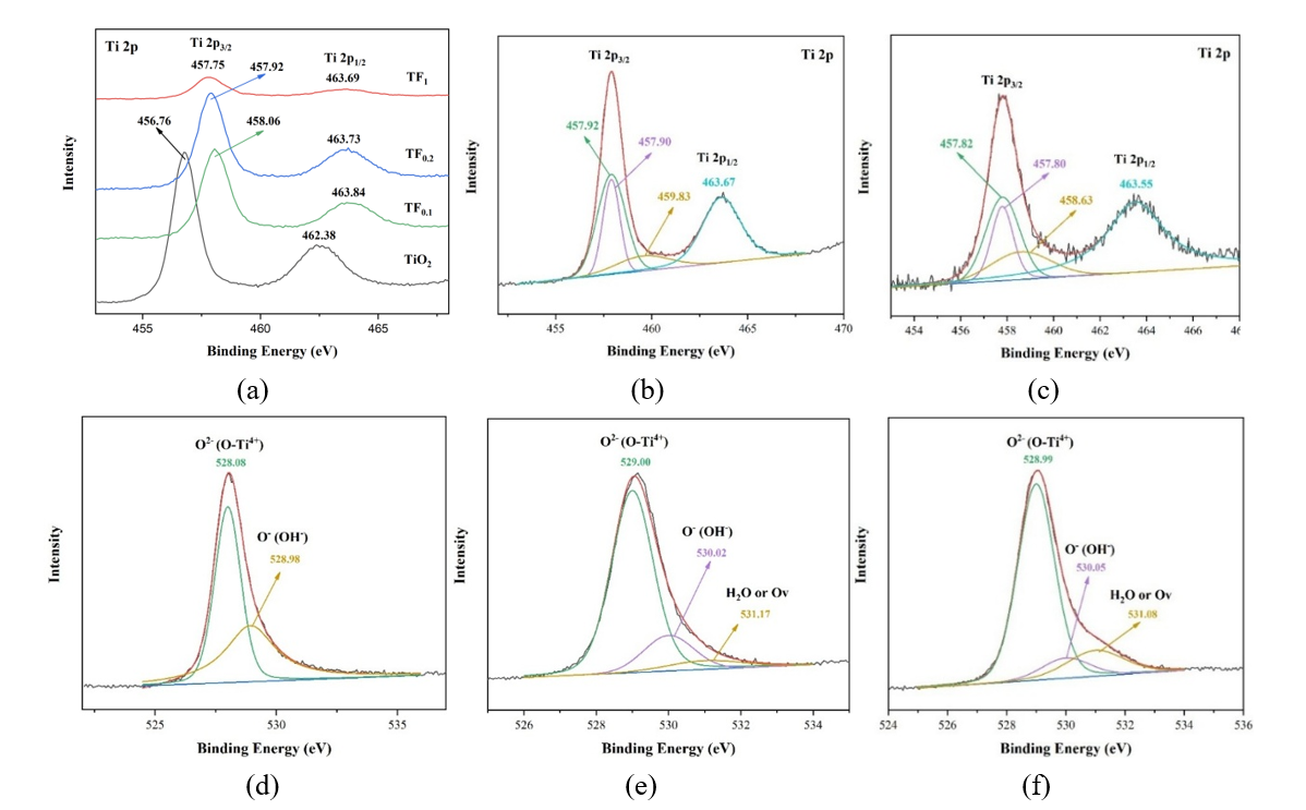 Figure 13 XPS Spectra (a) high resolution spectra (HRS) of Ti2p peak, (b) deconvolution spectra Ti2p of TF0.2, (c) deconvolution spectra Ti2p of TF1, (d) deconvolution spectra O1s of TiO2, (e) deconvolution spectra O1s of TF0.2, and (f) deconvolution spectra O1s of TF1.