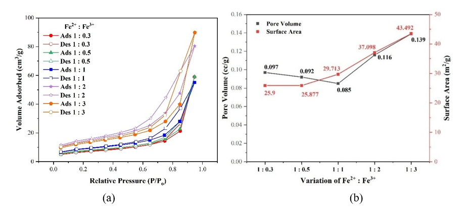 Figure 4 (a) Hysteresis loop Isotherm, (b) Pore volume and surface area of composite with Fe2+: Fe3+ composition (mole:mole).