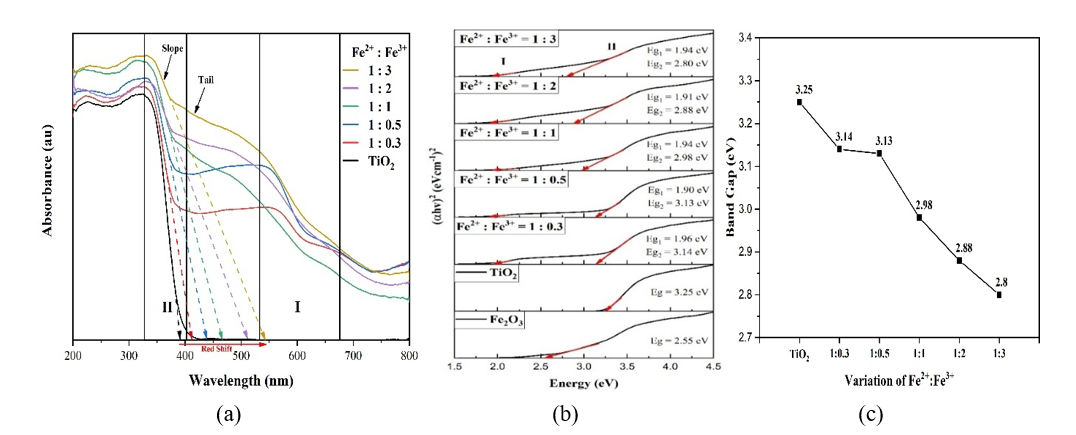 Figure 5 showed that increasing Fe³⁺ composition reduces the composite bandgap from 3.25 to 2.80 eV. The decreasing is attributed to 2 main mechanisms: Heterojunction formation between TiO₂ and Fe₂O₃, and Fe³⁺ doping. At lower Fe³⁺ content (Fe²⁺: Fe³⁺ = 1:0.3 - 1:1), bandgap narrowing is dominated by heterojunction formation, driven by interfacial interactions (sintering, coupling, aggregation) that modify the electronic structure without significantly altering TiO₂ intrinsic absorption slope and bandgap (Area II). Interfacial interaction does not directly change the intrinsic bandgap of TiO₂ but occurs through heterojunction formation [21]. The energy band gap of Fe2O3/TiO2 nanocomposites decreased as the Fe2O3 loading increased which can be attributed to the formation of heterojunction structure, and the formation of a new molecular orbital that results in reduced bandgap accordingly [3]. The formation of a heterojunction between TiO₂ and Fe₂O₃ involves the combination of two semiconductors with different band gaps. Since TiO₂ possesses a higher Fermi energy and lower work function than Fe₂O₃, electron transfer occurs from TiO₂ to Fe₂O₃ to equilibrate their Fermi levels.