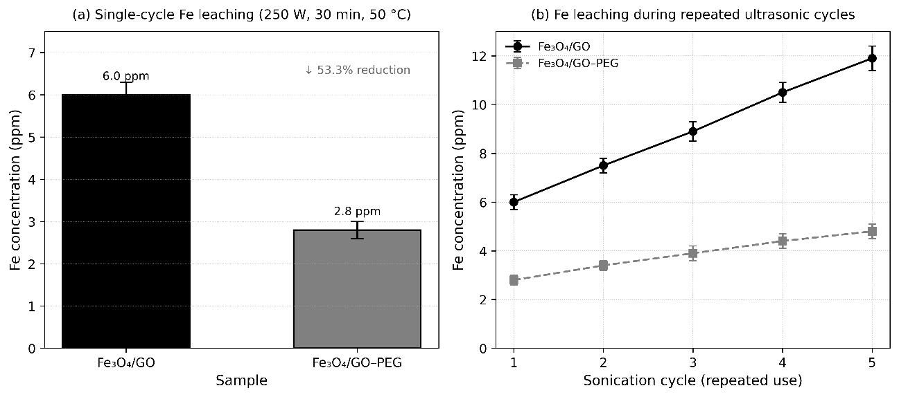 The iron leaching stability of Fe₃O₄/GO and Fe₃O₄/GO–PEG nanocomposites was evaluated using Inductively Coupled Plasma–Optical Emission Spectroscopy (ICP–OES, Agilent 5110, USA). Approximately 50 mg of catalyst was dispersed in 100 mL of deionized water and subjected to ultrasonication (250 W, 30 min, 50 °C). The sonication parameters (250 W, 30 min, 50 °C) were determined through internal optimization experiments to achieve homogeneous dispersion and stable cavitation without overheating or causing structural degradation. Lower power (<200 W) resulted in incomplete particle dispersion, whereas higher power (>300 W) induced partial aggregation and increased Fe dissolution. Therefore, the selected parameters provided optimal energy input for assessing Fe leaching behavior under representative ultrasonic pretreatment conditions.