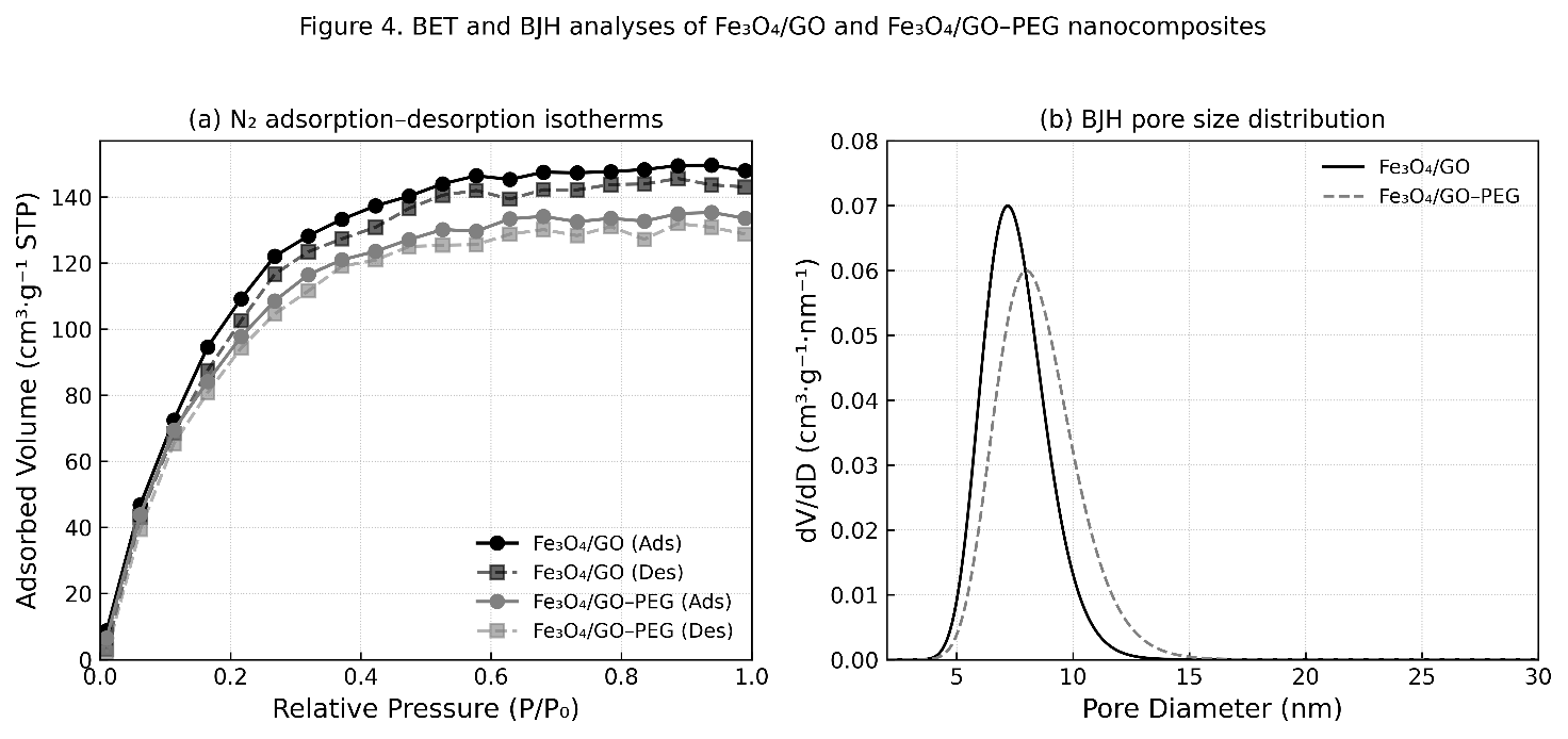 Although scanning electron microscopy (SEM) was not conducted, the surface morphology inferred from TEM and BET–BJH analyses indicates that Fe₃O₄ nanoparticles are uniformly distributed over the wrinkled GO surface with minimal aggregation. This nanoscale architecture corresponds well with the mesoporous texture and homogeneous surface area derived from BET analysis. Similar morphologies have been reported for Fe₃O₄/GO–PEG nanostructures stabilized by polymeric modifiers [35,36], reinforcing that PEG functionalization enhances interfacial adhesion, smooth surface coverage, and stable dispersion in aqueous systems.