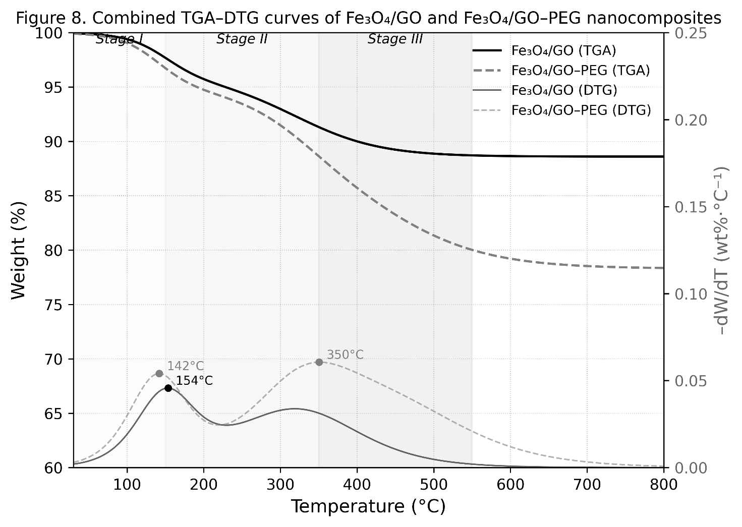 The TGA and DTG curves were used to determine the decomposition stages, total organic content, and thermal stability of the composites. Weight loss steps were correlated with moisture removal, oxidation of GO functional groups, and PEG degradation, confirming successful polymer incorporation and enhanced thermal endurance.