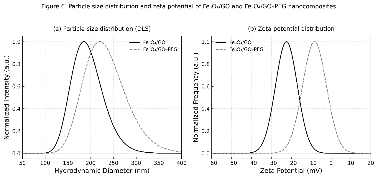The hydrodynamic diameter and zeta potential of Fe₃O₄/GO and Fe₃O₄/GO–PEG nanocomposites were measured using a Zetasizer Nano ZS (Malvern Instruments, UK) at 25 °C. Each sample (0.1 mg mL⁻¹) was dispersed in deionized water and ultrasonicated (100 W, 10 min) prior to measurement. The results were obtained as the average of three replicates. The DLS analysis provided the mean particle size distribution, while the zeta potential indicated the surface charge and colloidal stability in aqueous suspension.